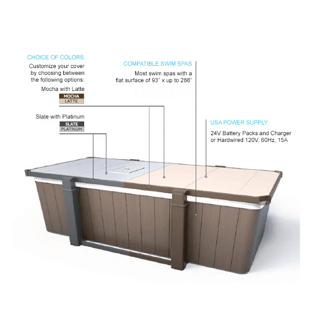 With the Covana LEGEND, your swim spa will be more accessible and easier to use than ever! In almost any weather condition, the cover can be retracted with the simple turn of a key and after only a few seconds, you can dive in and enjoy it without ever having to struggle with a cumbersome cover – it’s fully automated! When closed, this robust cover, with a far higher insulation value than more traditional hot tub covers, provides unequaled protection while preventing undesirable access to children, animals, and intruders. Once opened, its roof will protect you from bad weather conditions and sturdy design will ensure your peace of mind, regardless of how bad the conditions are. In addition, its flexible design makes it ideal for both oval and rectangular swim spas.